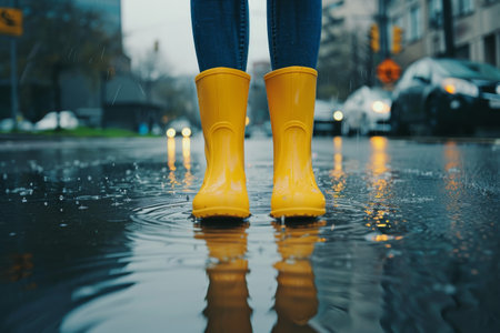Close-up of yellow rubber boots standing in a puddle on a rainy day with city lights reflecting