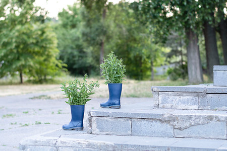Two pairs of rubber boots with a bouquet of green mint on the stone steps on the street against the backdrop of green trees. soft focus.