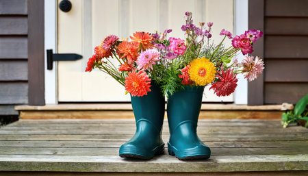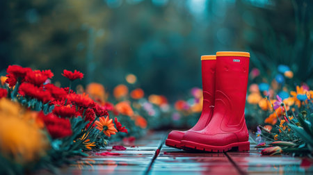 A pair of red rubber boots among colorful garden flowers, on a wooden deck against a vibrant background. High quality illustration