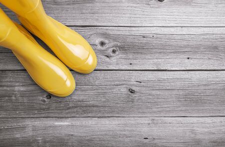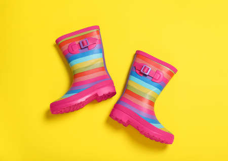 Women's yellow rubber boots on a black background and men's black rubber boots on a yellow background stand opposite each other. Close up.