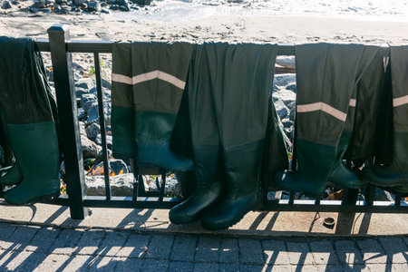 Several pairs of dark green fishing waders hang on a fence near the beach, with water in the background.