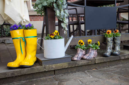 In Staithes North Yorkshire UK rubber Wellington Boots are arranged as flower pots