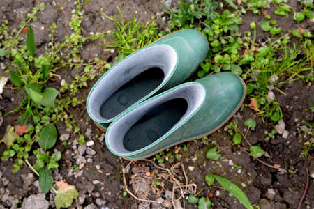 Green rubber boots in a vibrant flower garden with colorful blooms and rich soil, gardening concept