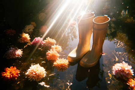 A pair of stylish rain boots stands alone in a sunlit garden, surrounded by colorful flowers, showcasing a peaceful and vibrant outdoor scene filled with natural beauty.