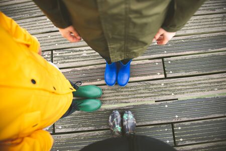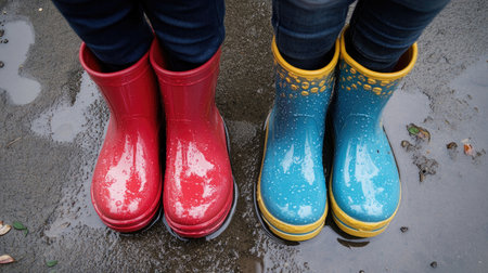 Two pairs of colorful rain boots stand in puddles on a wet ground, capturing the essence of playful outdoor fun during a rainy autumn day.