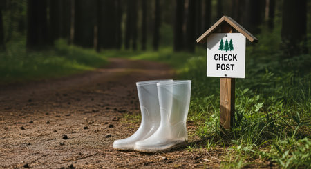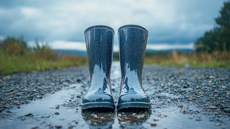 A pair of stylish rain boots stands in a puddle on a gravel path, surrounded by greenery under a dramatic cloudy sky, evoking adventure and outdoor spirit.