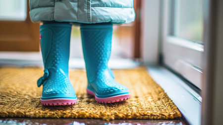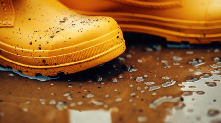 Generative AI : Feet of child in yellow rubber boots jumping over a puddle in the rain