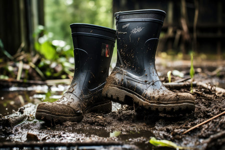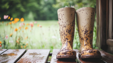 A pair of vintage rubber boots, splattered with mud, sit on a rustic wooden deck. Lush greenery and colorful flowers create a serene outdoor scene, evoking tranquility.