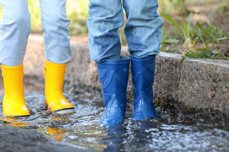 Mischievous preschooler child wearing yellow rubber rain boots jumping in large wet mud puddle. Kid playing and having fun. Outdoors games for children.