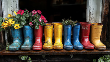Colorful flowers sprout from vibrant boots, welcoming spring on a lovely porch.