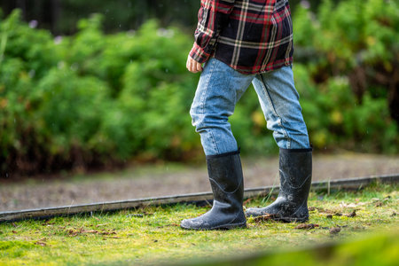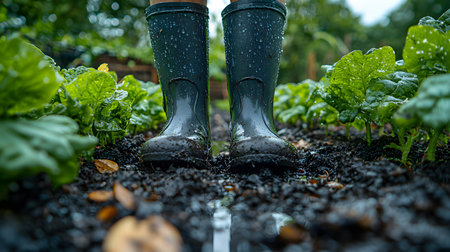 A low angle shot of a person in muddy rubber boots standing in a vegetable garden after a light rain, with freshwater droplets on leaves and soil