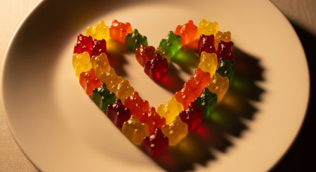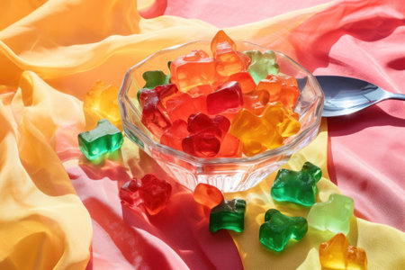 a spoonful of gummy bears on a bright tablecloth, created with generative ai