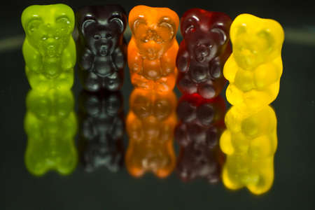 The gummy bears stand tightly to each other on the mirror and are reflected on it.