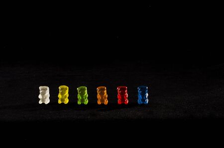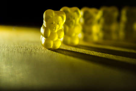 Sweet gummy bears stand on a wooden background, behind the shadow on a wooden plank of gummy bears. Gummy bears are in a row.
