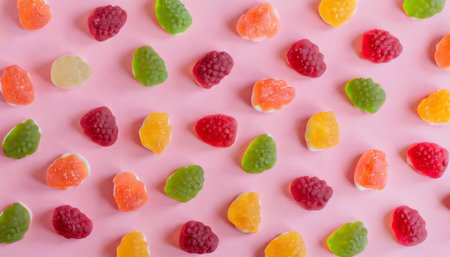 colorful gummy candies pattern on a pink background soft gums in fruit shapes viewed from above variation concept top view