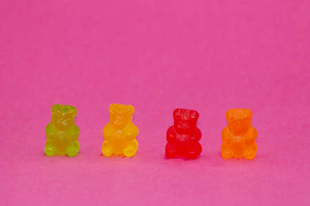 Bright gummy bears of various colors sit together in a playful arrangement, tempting sweet lovers.