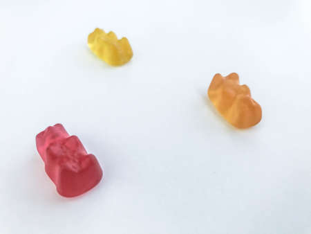 gummy bears on a white matte background. red, yellow and orange bear lie on the table. delicious sweets, treats of people. candies of our own production. sweets for decorating cakes and pastries.