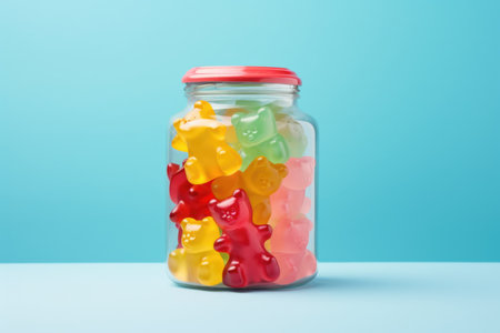 photography minimalism macro of chewable vitamins in the form of bears in a glass jar on a blue background --chaos 20 --ar 3:2 --v 5.2 Job ID: 4cd0d836-b655-4f6b-ae42-fc95932b29b5