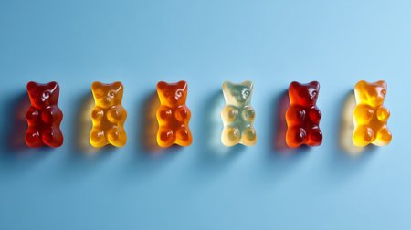 Gummy bears isolated on pastel blue surface, evenly spaced, minimalist style.