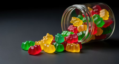 Colorful gummy bears spilling from glass jar onto dark surface in closeup candy arrangement with vibrant red green yellow sweets.