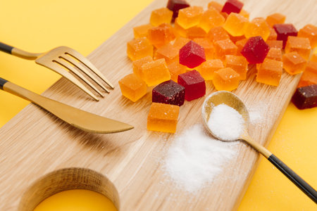 Yummy candied fruit jelly on a wooden plate with spoon, fork and knife