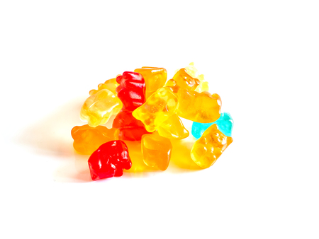 Closeup of colorful gummy bears jelly candies scattered diagonally isolated on white background