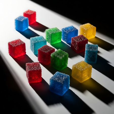 Colorful fruit jelly cubes sparkle with brightness, casting reflections on a white surface in a cheerful display, highlighting their translucent qualities.