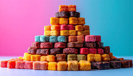 A meticulously constructed pyramid of colorful, sugar-dusted gummy cubes stands as a monument to sweetness and fun. Set against a vibrant pink and blue background, this tower of assorted treats evokes a sense of playful achievement and joyful indulgence.