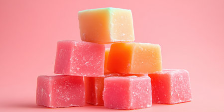 Colorful gelatin cubes pyramid arrangement sugary dessert sweet treat pastel background clean studio.