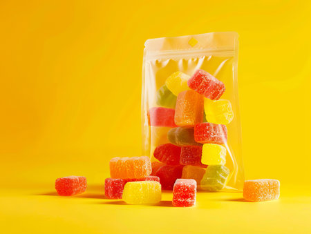 A bag of gummy candies on a yellow background.