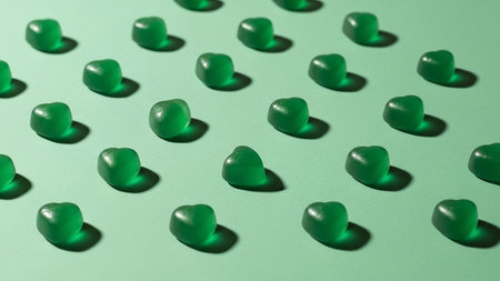 Dfgdguh showing green heart shaped gummy candies arranged in a grid pattern. High resolution image suitable...