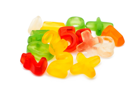 Close up shot of different colorful sweets, sugar jelly candies isolated over white background