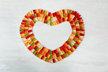 Flat lay with round from gummy bear on white background