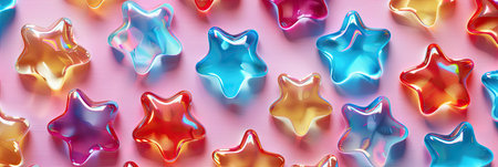 A vibrant arrangement of shiny jelly stars in various colors creates a playful and engaging seamless pattern. The glossy surface reflects light, enhancing the visual appeal and texture. This delightful design offers a cheerful aesthetic suitable for various creative projects.