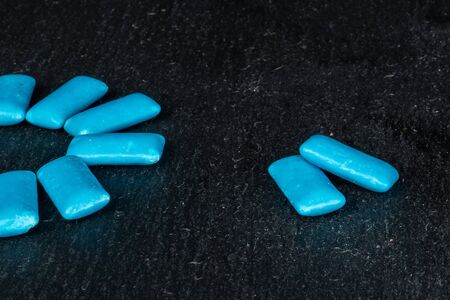 Group of eight whole blue chewing gum on grey stone
