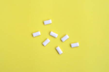 Top view of white chewing gums on yellow background