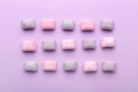 Colorful chewing gum arranged on a green surface