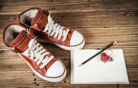 Red Canvas Shoes and notebook on Wood Background