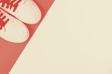 Top view of a white sneaker with laces on a red and brown background. Minimal sports concept. flat lay.