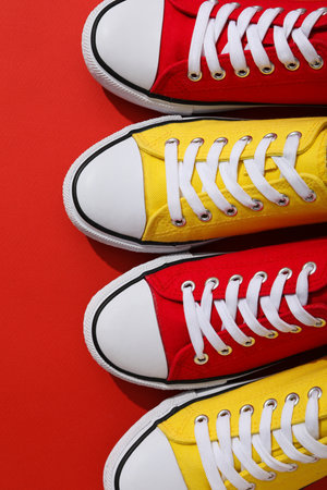 Dirty shoes top view of red sneakers display on yellow background.