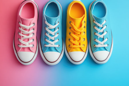 Four pairs of brightly colored sneakers are neatly placed on a gradient background showcasing pink blue and yellow hues.