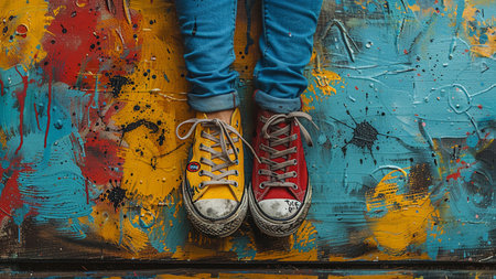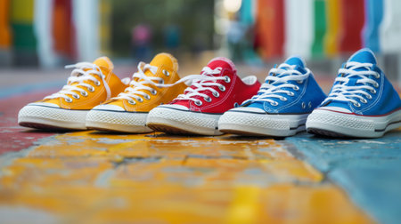 A close-up of colorful sneakers in yellow, red, and blue lined up on a vibrant urban street with a colorful background. Perfect for urban and lifestyle themes.