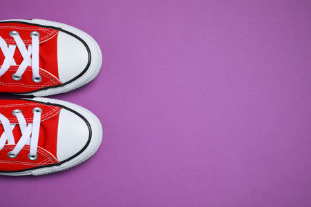 Pair of new stylish red sneakers on purple background, flat lay. Space for text