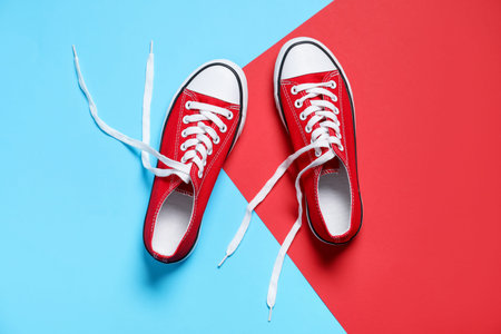 Pair of stylish sneakers on color background, top view