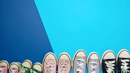 many multi-colored well-worn textile sneakers of different sizes on a blue background, top view, concept, family and team, friendship, copy space