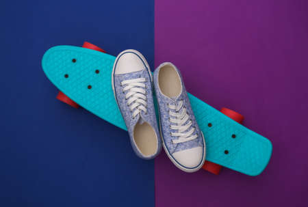 Cruiser board with sneakers on purple blue background. youth entertainment. hipster outfit. top view. flat lay