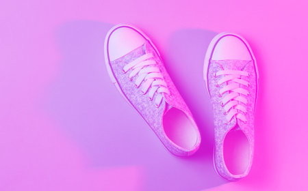 Closeup female sports shoes, sneakers isolated over neoned background. Urban city fashion, fitness, sport, training concept.