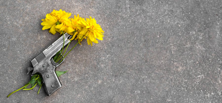 Gun and yellow flowers on asphalt. concept of memory, fragility of peace, no war, stop war, world peace, pacifism. Banner, copy space, text space, template, layout, mockup