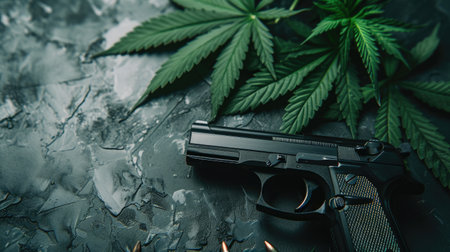 Crime concept of marijuana leaves of cannabis and hangun isolated on white background.