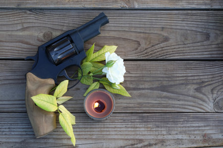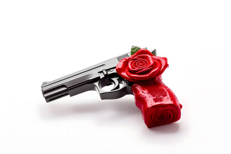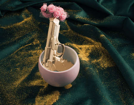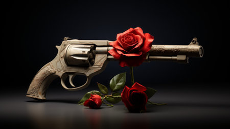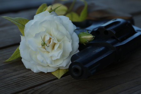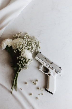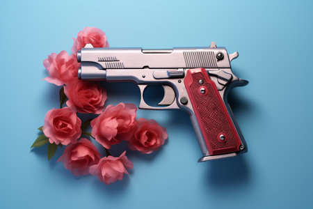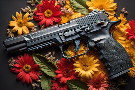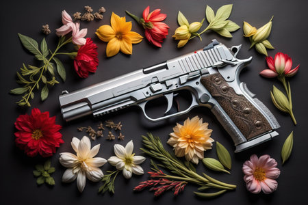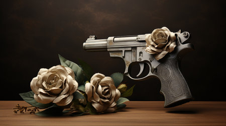A bouquet of flowers and a gun on a table. Generative AI image.